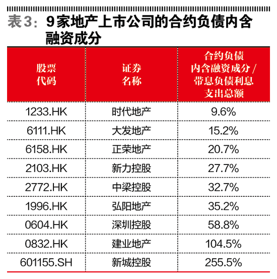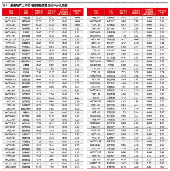 我们以企业当期合约负债内含融资成分的资本化利息额与含资本化利息的利息支出总额之比来度量相关隐性负债的大小,当该比值为0时为10分,比值大于50%时为0分,中间数值插值赋分,由此得到地产上市公司的合约负债内含融资成分的风险评分。结果显示,84家主要地产上市公司中,有9家公司有合约负债内含融资成分,有3家公司合约负债内含融资成分的资本化利息额超过了当期利息支出总额的50%(表3)。