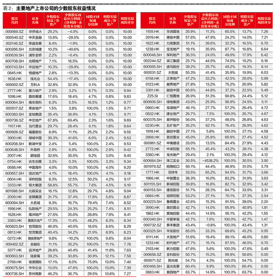 除了表外负债,明股实债也成为近年来地产企业转移表内债务的重要渠道。在明股实债安排下,项目公司层面的少数股东权益具有较强的债性,它体现为利润分配上的同股不同权,即,在项目公司亏损时,少数股东不承担或少承担亏损,而在项目盈利丰厚时,少数股东只获取相对固定的利润分配。为此我们以净资产中明股实债的成分比例来测度企业的明股实债风险,其中:净资产中明股实债的成分比例=少数股东权益占比×少数股东权益中同股不同权的成分比例=少数股东权益/剔除永续资本后的净资产×少数股东权益中同股不同权的成分比例。