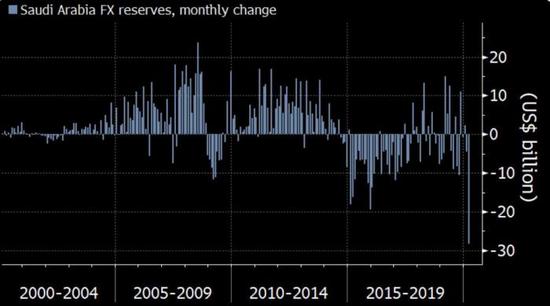 彭博汇编的数据显示,沙特央行3月外汇储备的跌幅超过1000亿里亚尔(约合270亿美元),至4640亿美元,这是2011年以来的最低水平。上周,沙特财政部长穆罕默德·贾丹(Mohammed Al-Jadaan)表示,沙特全年最多只会动用多达1200亿里亚尔的储备金。