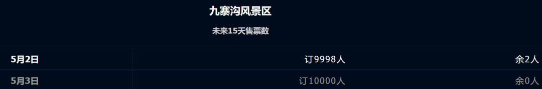 根据九寨沟景区官方网站显示,截至5月1日晚22点30分,九寨沟景区5月2日的门车票网络预售仅剩2人的位置,3日已达到疫情防控期间每日最大限量10000人次,显示为无票状态。景区建议选择错峰游览或到其他景区观光游览。
