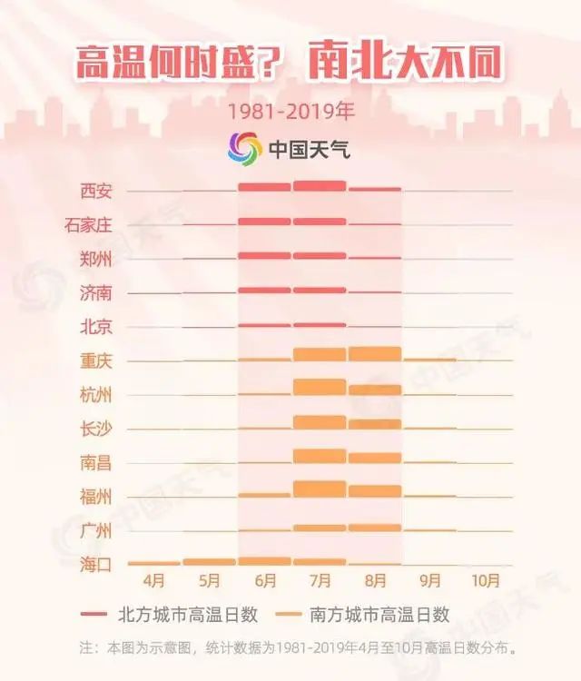 北方高温“起步”相对较早,6月至7月为集中爆发期, 6月份,西安、石家庄、郑州等城市的平均高温日数能达到5-7天,7月更往往能达到5-10天,北京、天津这两月的平均高温日数也能有3-4天。