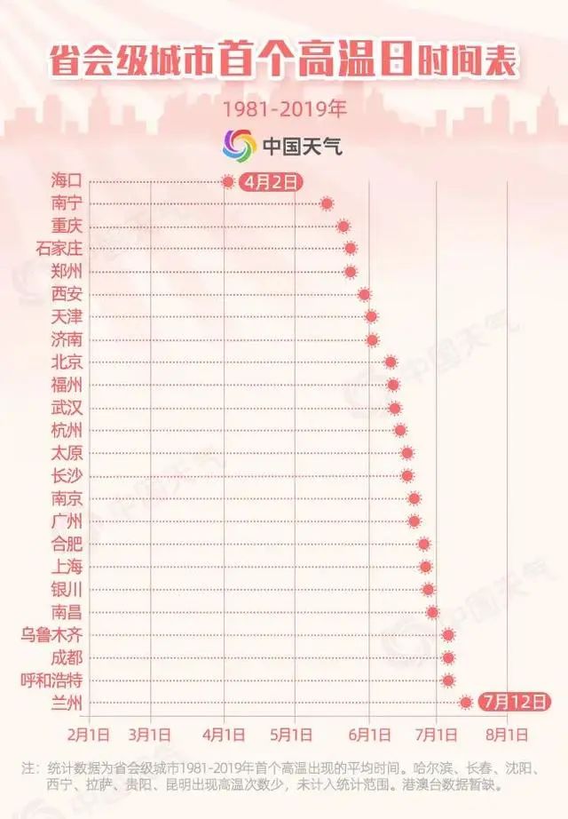 南方大部地区高温集中出现的时间明显晚于北方,常年7月至8月才进入高峰期,但部分城市高温日数会后来居上,像是杭州、长沙、南昌、福州等城市7月平均高温日数能达到12-15天,比北方城市日数更多。此外,海口由于特殊的地理位置,4月至8月都可能连续出现高温。