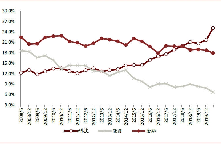 图表: 2008-2020能源、金融和数字产业占全球股票市场总市值比例的变化