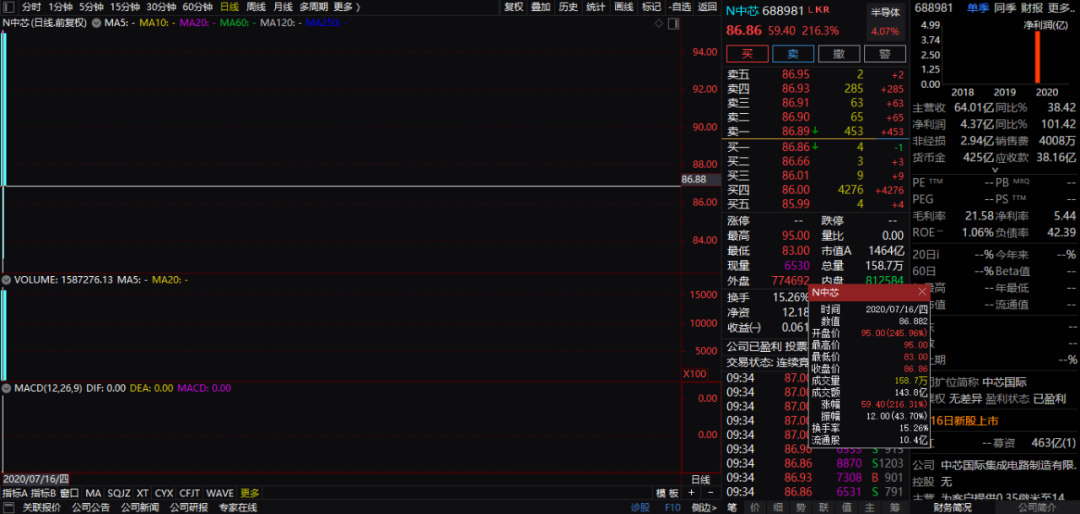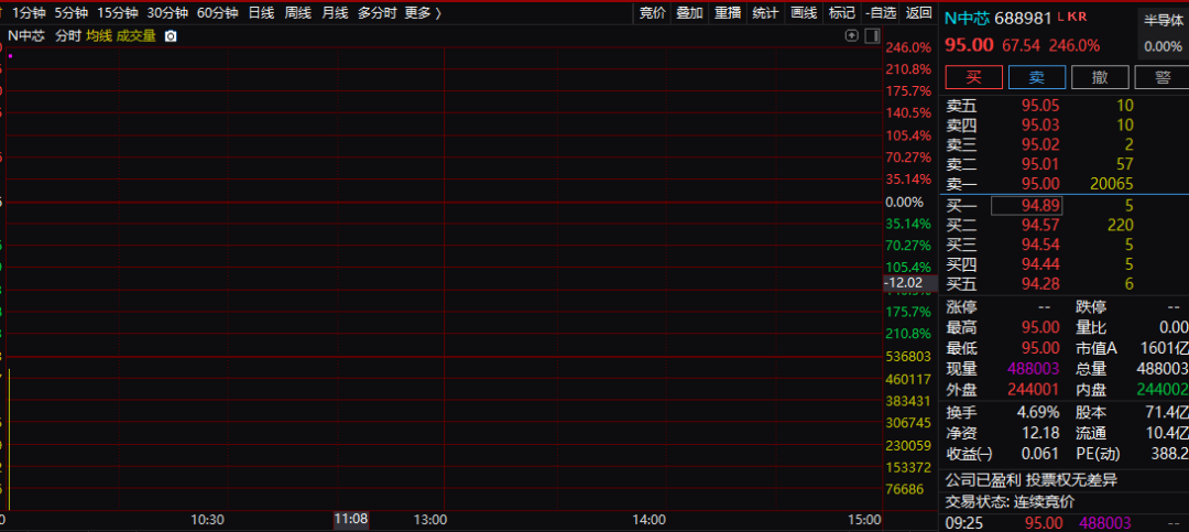中芯国际今日登陆科创板,开盘报95元,上涨246%,成交金额超过46亿。而两市集合成交仅180亿元,在开盘之后五分钟之内,中芯国际成交金额达144亿元,半小时吸金超262亿,吸金效应显著。