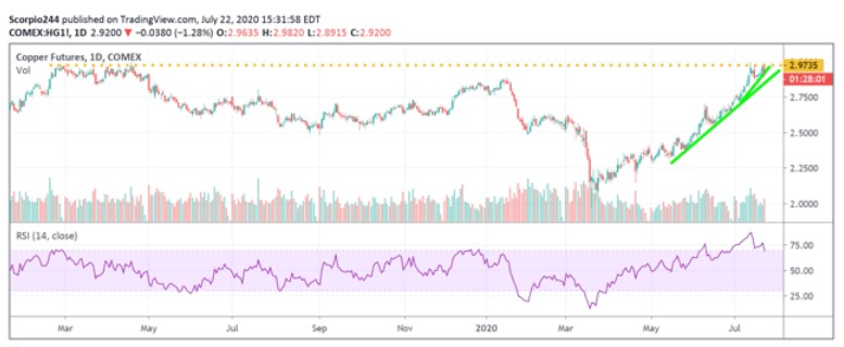 铜价已从3月份的低点大幅上涨,但目前呈现出看跌趋势。在图表中已经形成了一个熊市的起伏和运行模式。这是一个反转模式,暗示最近的高点即将被打破。此外,铜价已触及3美元的固定阻力位。