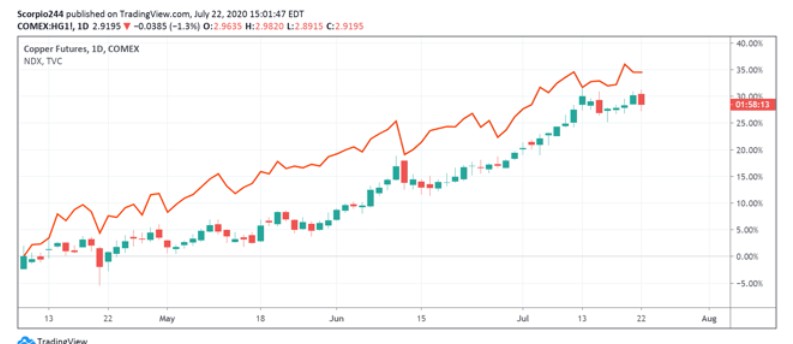 过去几个月,纳斯达克100指数和铜价一直非常密切地相互追踪。尽管铜价和纳斯达克指数之间几乎没有直接或间接的联系,但它们代表着增长和风险偏好。因此,如果这两种资产中的一种出现了崩盘的迹象,那么另一种资产也很可能会崩盘。此外,这种崩盘迹象可能意味着风险交易正在破裂。