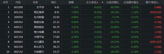 太平洋、君正集团、东方财富分别遭主力资金卖出9.82亿元、8.24亿元、6.55亿元。