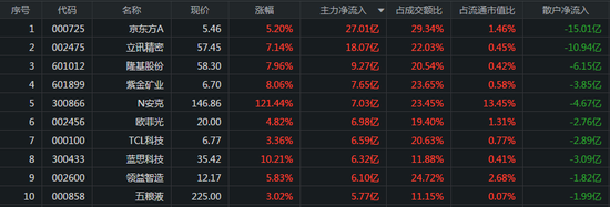 从个股来看,主力资金最青睐的3只股票分别是京东方A、立讯精密、隆基股份,流入金额分别为27.01亿元、18.07亿元、9.27亿元,所对应的涨幅分别为5.20%、7.14%、7.96%。