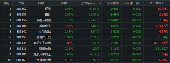 主力资金流出的板块分别是证券、银行、保险,主力资金流出金额分别为42.55亿元、13.87亿元、12.60亿元,其中散户净流入金额为15.32亿元、2.28亿元、2.64亿元。