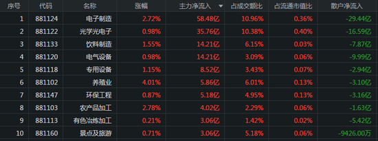 主力资金主要电子制造、光电、饮料制造三个板块,流入金额分别为58.48亿元、35.76亿元、14.215亿元,其中散户净流入金额为-29.44元、-16.59亿元、-7.87亿元。三个板块的涨幅分别为2.72%、0.98%、1.55%。