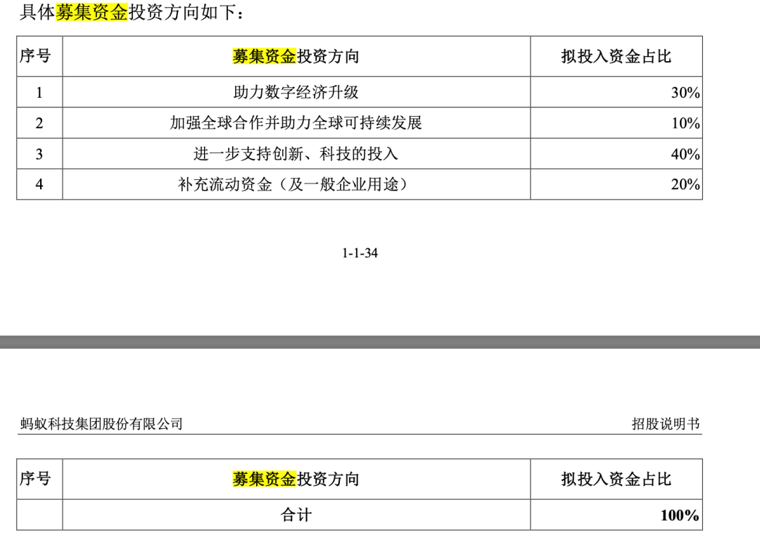在蚂蚁集团的科创板IPO申报稿中,其并未透露具体的融资额度,但表示募投项目主要将投向“助力数字经济升级”、“加强全球合作并助力全球可持续发展”、“进一步支持创新、科技的投入”及补充流动资金等四大募集资金投资方向。