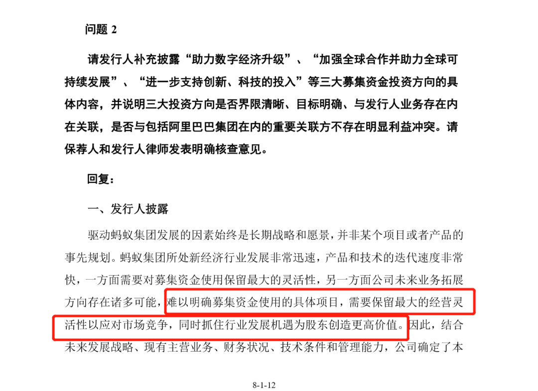 然而在9月22日晚间,蚂蚁集团对有关审核意见的回复函中更是“霸气”地回复坦言:“难以明确募集资金使用的具体项目,需要保留最大的经营灵活性以应对市场竞争,同时抓住行业发展机遇为股东创造更高价值。”