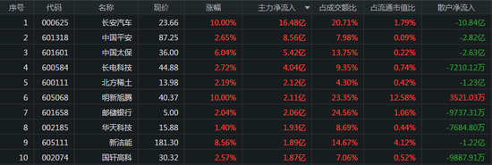 从个股来看,主力资金最青睐的3只股票分别是长安汽车、中国平安、中国太保,流入金额分别为16.48亿元、8.56亿元、5.42亿元,所对应的涨幅分别为10.00%、2.65%、6.04%。