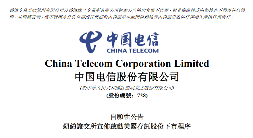 中国电信称,对纽约证交所上述决定和行动表示遗憾。纽约证交所将本公司美国存托股份退市之决定可能对本公司的H股股票和美国存托股份的交易价格及成交量产生影响。本公司将继续密切关注相关事项的进展,并正在考虑相应方案和寻求专业意见,以保护本公司的合法权益。