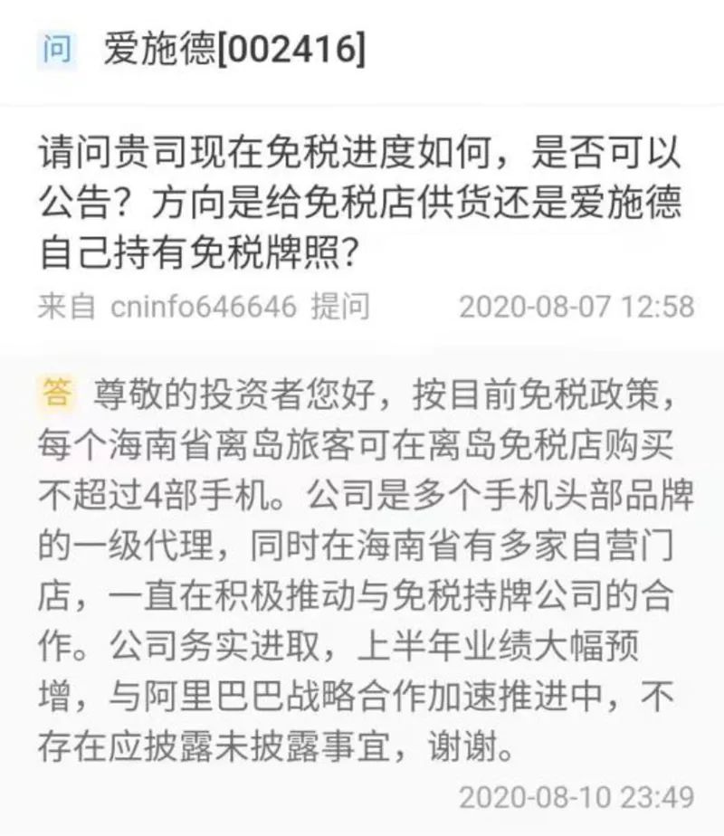 2020年4月27日,爱施德宣布拟引入阿里作为战略投资者,表示双方已成立合作公司“爱巴巴”,随后公司股价大幅上涨。