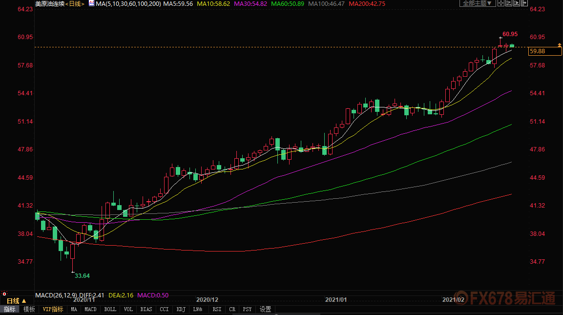 摩根大通分析师上周在一份报告中称,由于华尔街押注经济将从疫情中强劲复苏,大宗商品似乎开始了一个将持续数年的新超级周期。摩根大通的马雷克表示,油价可能会“大幅上涨”。从高盛集团(GoldmanSachsGroupInc.)到美国银行(BankofAmericaCorp.),再到Ospraie管理公司(OspraieManagementLLC),都认为大宗商品将出现牛市,因为政府刺激计划开始生效,全球各地都在部署疫苗抗击冠状病毒。这种乐观情绪已推动对冲基金对大宗商品的多头押注达到10年来最高水平。本周,美原油一度突破60美元大关,周三(2月17日),油价震荡回落至60美元下方。