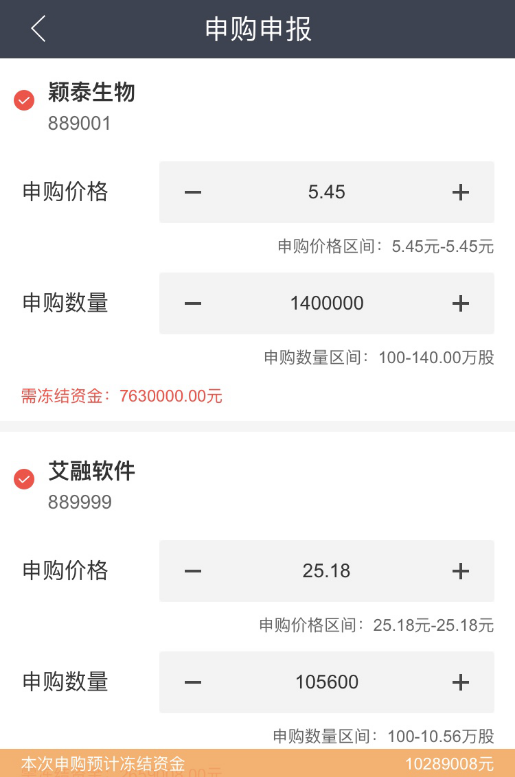 举个列子,通过某券商APP平台上同时对颖泰生物和艾融软件进行网上申购,若同时顶格申购,需要冻结资金1028.90万元。