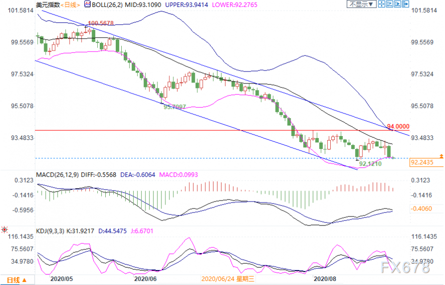 下行方面,强支撑仍重点关注前低92.12。上行阻力,先留意布林带中轨92.84;进一步看向8月21日高点93.48,这同时与布林带上轨接近,有明显压制性。