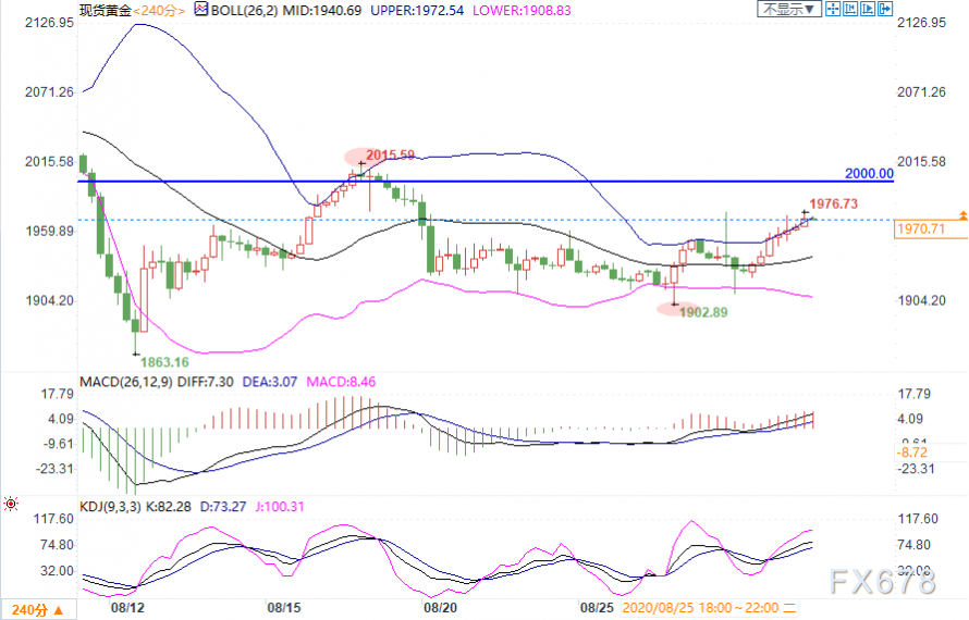 日内小幅走高,整体维持震荡微涨。从当前走势来看,多数投资者仍押注多头,金价有望重新涨向2000关口上方。尽管美国经济数据以及国际局势的改善,一度施压黄金逼近1900美元,但随着鲍威尔强调就业并引入平均通胀目标、日本首相安倍晋三的辞职,再度推升作为避险商品黄金的走势。