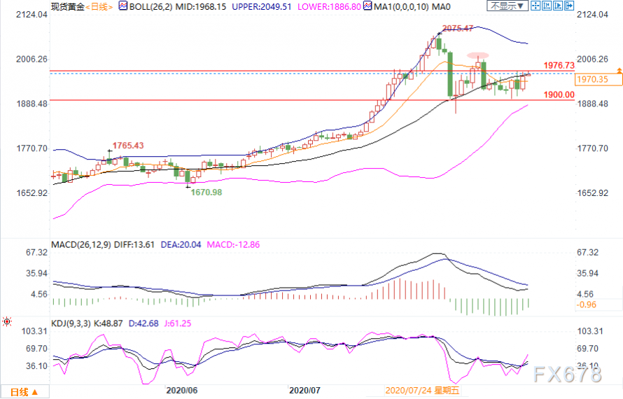 上行方面,先留意日内触及高点1976.73,该点位附近自7月底以来被多次测试。进一步阻力位上看8月18日高点2015.59,一旦该点位被突破,有望提振金价上看布林带上轨2049.50,甚至可能再度测试纪录高点2075.47。