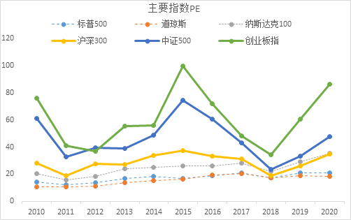 比较A股和美股的主要股票指数的PE值,A股中证500指数、创业板指都明显高于美股的三大指数,只有沪深300指数的PE值更低。