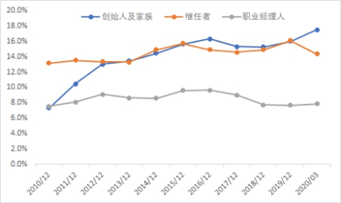 比如,我们在《流动性危机解除后,美股中长期仍很脆弱》中统计了标普500指数成分股中市值最大的60家公司的资产负债率、过去10年回购股数占比、研发支出占营收的比例。发现职业经理人掌控的公司表现出更高的负债率和更大的回购力度,而研发支出占比却明显较低。可见,职业经理人更加追求公司的短期业绩和股价表现。随着美股上市公司的创始人及其继任者陆续退出,职业经理人接管,美股急功近利的现象将会更加明显。