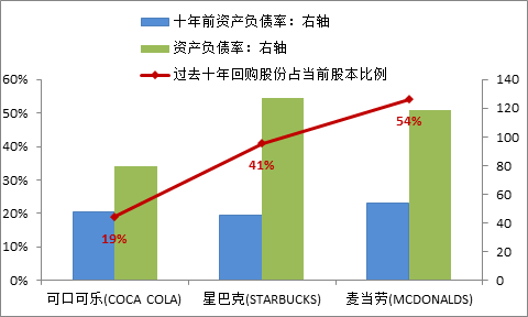 图表8 三个美股消费龙头公司过去十年的资产负债率变化以及回购股份占比