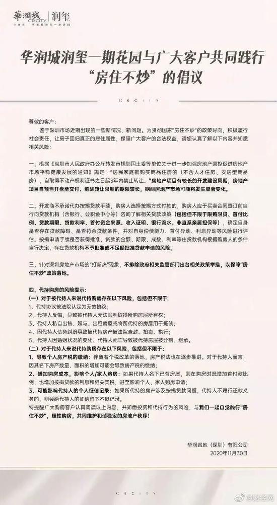 30日晚间,被央媒点名的深圳“网红”楼盘华润城润玺一期刚刚发布《与广大客户共同践行“房住不炒”的倡议》,文中称“针对深圳房地产市场的’打新热’现象,不排除政府相关监管部门出台相关政策举措,以保障“房住不炒”政策落地,并提示代持购房风险。