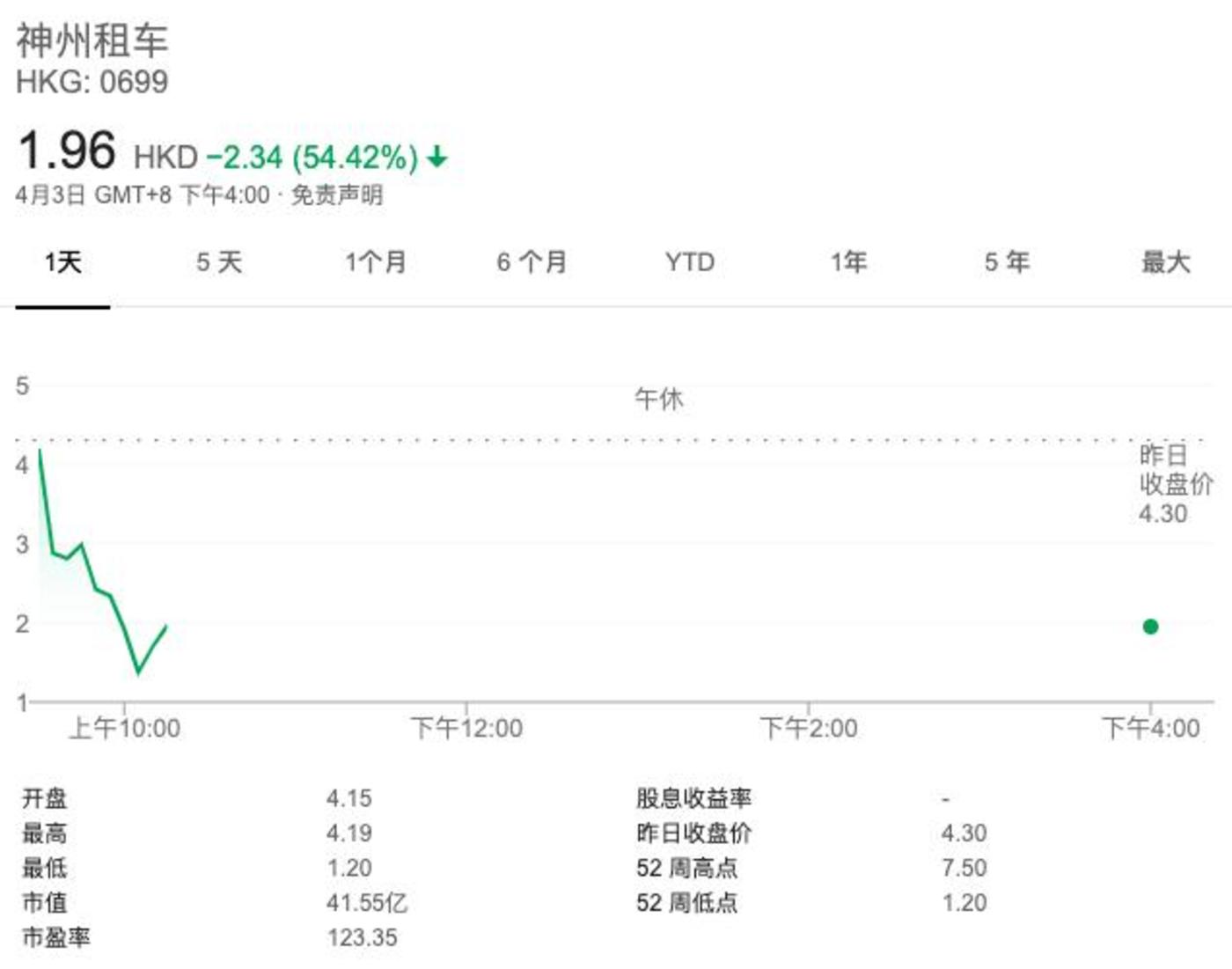 4月3日,在港股上市的神州租车暴跌54%,每股跌至1.96港元,刷新历史最低价。开盘不久后,神州租车对外发布公告,暂停交易。在新三板上市的神州优车则大跌21.75%,股价跌至9.5元,创下历史新低。