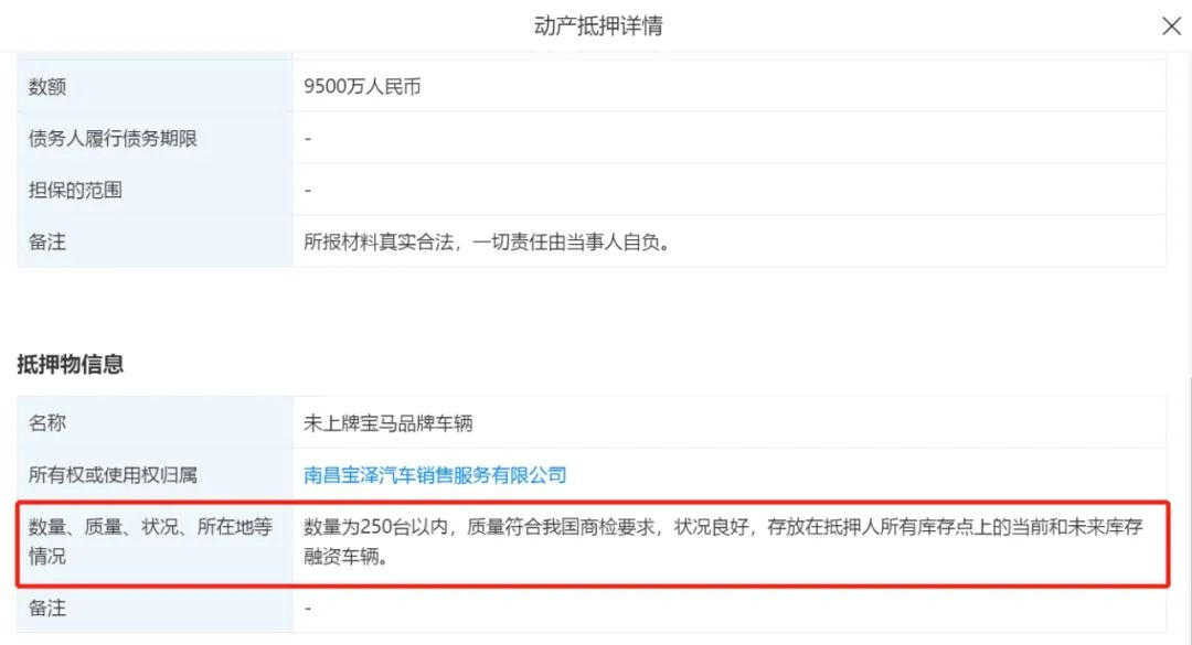 4S店口中所说的“合格证赎不回来”,这类情况是否正常?天眼查APP数据显示,南昌宝泽汽车销售服务有限公司为赣州宝泽的全资股东。2020年4月16日,南昌宝泽在江西省南昌经济技术开发区市场监督管理局登记了一笔9500万人民币的动产抵押,抵押物即为未上牌宝马品牌车辆。多家宝泽4S店都存在同样的抵押情况。