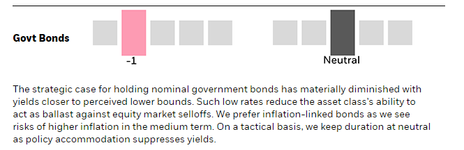 贝莱德认为, 随着收益率接近预期的下限,持有政府债券的战略理由已大幅减少。如此低的利率降低了这类资产在股市抛售中充当压舱石的能力。“我们更喜欢通胀挂钩债券TIPS,因为我们看到中期通胀上升的风险。在策略上,我们将债券久期保持在中性水平,因为前所未有的政策宽松抑制了收益率。”报告写道。