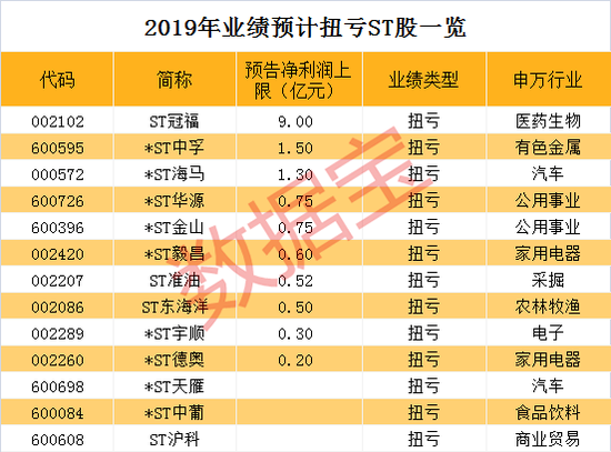 证券时报•数据宝统计显示,截至1月17日,共有51只ST股公布了全年业绩预告,业绩预告类型显示,包括*ST海马在内,扭亏股有13家。