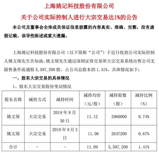 而早在去年9月5日和12月17日,姚记科技控股股东兼实控人姚文琛、副总经理宋秀文已经分别完成减持操作,累计减持公司股票5,634,700股,合计占公司总股本的1.42%。