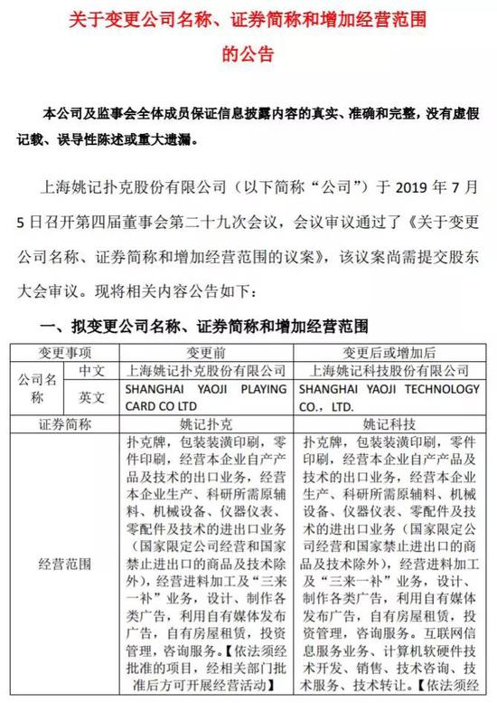 打铁要趁热,2019年8月,姚记扑克宣布变更公司名称、证券简称和增加经营范围。从此“姚记科技”取代了“姚记扑克”,公司经营范围增加了互联网信息服务业务等。