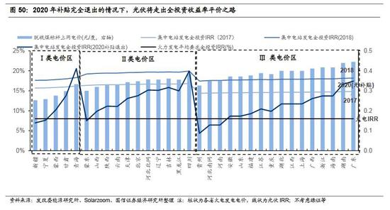 系统成本下降,非系统成本通过政策削减,国内光伏进一步加速平价。发电端平价是光伏与其他形式电力之间的对比,其中煤电发电成本最低,所以光伏发电端平价可以近似比较的是:无补贴下,光伏发电全投资IRR等于火电(脱硫煤电)期望IRR。当前,全国各省区火电上网标杆电价0.25~0.45元/KWh,在2020年补贴全部退出、火电标杆价格不变的假设下,2020年全国32个电力区实现光伏平价的区域达27个,占全部电力区84%。