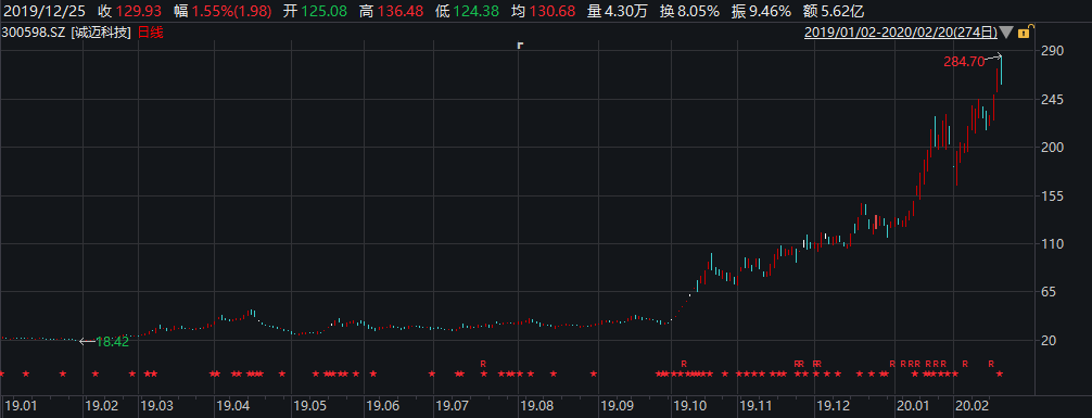 诚迈科技在2019年着实风光。若从2019年1月31日收盘价18.6元的低点算起,到2020年1月16日收盘价的216.55元,近一年时间里涨幅高达1064.25%,成为农历猪年里一只妥妥的十倍股。