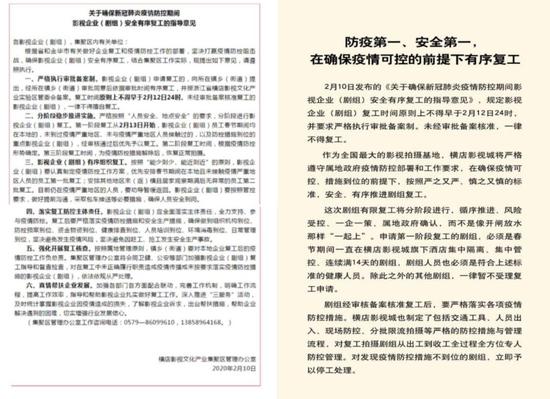 “《意见》是政府层面的一个指导意见。主要是因为留在横店的剧组年前就在横店,停工后也一直在横店,相对比较安全,横店目前也未出现病例,在这一前提下,政府提出指导意见可以考虑复工。但现在还是非常严格的管控时期,我们目前也还在做大量的前期筹备工作。”许晓芩告诉记者。