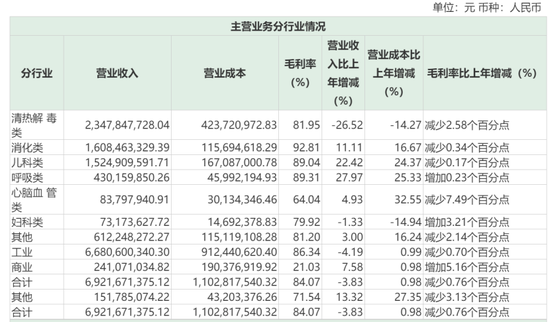 其他产品如消化类雷贝拉唑钠肠溶胶囊、儿科类小儿豉翘清热颗粒、其他类蛋白琥珀酸铁口服溶液等实现销售收入增长。但消化类和儿科类产品毛利率分别下滑0.34个百分点、0.17个百分点。