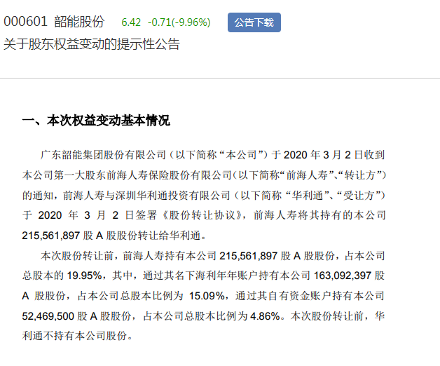 3月3日,韶能股份公告,公司第一大股东前海人寿3月2日签署《股份转让协议》,将其持有的2.16亿股股份转让给华利通。转让完成后,华利通取代前海人寿成为韶能股份第一大股东,持股比例为19.95%。