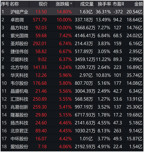 板块内,科创板个股沪硅产业大涨超14%、卓胜微、晶方科技涨停,紫光国微、圣邦股份、捷佳伟创、芯能科技、北方华创等概念个股涨超6%以上。