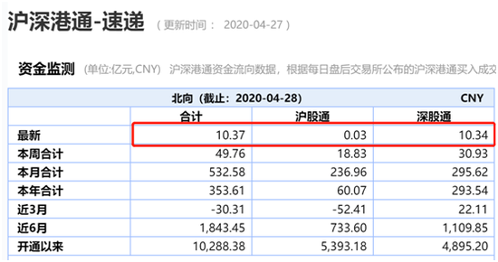 4月28日当天,北上资金依旧维持净买入趋势,当天净流入超10.37亿元,其中沪股通仅为0.03亿元,而深股通则高达10.34亿元。