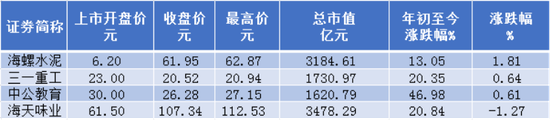 其中,海螺水泥当天最高触及62.87元(前复权),超出3月高点,创下历史新高,年初以来,涨幅超13%。三一重工最高触及20.94元;中公教育最高触及27.15元。这3家公司当天股价小幅收涨。