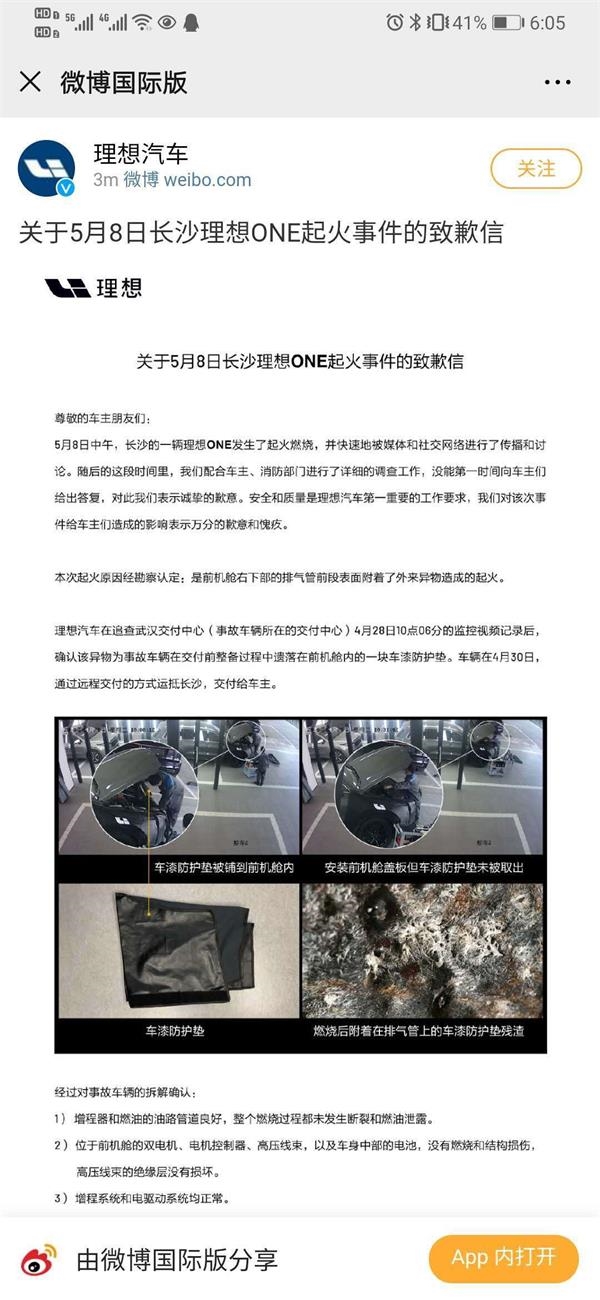 根据理想汽车5月21日公布的对长沙理想ONE自燃事件的初步调查结果,起火原因经勘察认定是前机舱右下部的排气管段表面附着了一块车漆防护垫造成的起火。彼时就有网友认为,这正是理想汽车方面的管理失误。