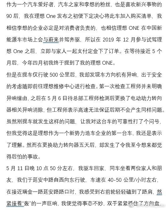 “5月12日,最先联系我们的理想市场部的人,让我们按照他们的稿子发微博,我才知道网上的帖子和微博都在热议。我们不愿意,因为作为车主,我最在意的是我买的车是否真的安全。”该车主表示。