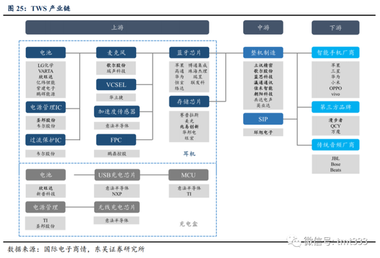 TWS产业链主要包括上游元器件供应商、中游整机制造商以及下游的终端品牌厂商。其中,上游元器件主要有电池、电源管理IC、麦克风、FPC、蓝牙芯片和存储芯片等;整机制造商以具备声学精密组件加工能力的OEM/ODM厂商为主;下游终端品牌厂商主要包括智能手机厂商、传统音频厂商和第三方品牌厂商等。