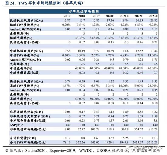 我们将全球TWS耳机分为两大阵营,AirPods苹果端和非苹果端(以Android安卓端占主要)为主[1]。AirPods渗透率于2019年已经达到6.67%,因为供需关系以及近来电商价格有下降趋势[2],我们预测AirPods在2020-2022的渗透率为13.34%,16%,19%,并在2023有望达到25%。非苹果TWS耳机用户人群结构跨越大,因此我们将非苹果端分为三大阵营,低端机(价格在0-1999之间),中端机(价格在2000-3999之间),高端机(价格在4000以上)来进行渗透率分析预测[3]。我们预测高端机客户对于TWS需求将与苹果端客户需求趋同,因此渗透率预测与AirPods渗透率保持一致,中端机用户群体则稍显延迟,2020-2022渗透率为4.72%,6.83%,9.72%,并有望在2023年达到13%。我们预测低端机用户群体对TWS耳机需求并不强烈,但是由于一些低端TWS耳机可以触及下沉市场[4],我们预计其2020-2022渗透率为2.67%, 4.72%, 6.83%, 并于2023年有望达到9.72%。