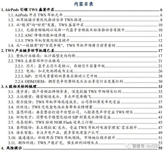 2)新品推出不及预期:TWS 等产品研发的专业化程度较高,存在一定技术壁垒,技术开发难度和研发投入大,若新一代产品研发进度不及预期,相关公司核心业务的营收规模和增速可能受到影响。