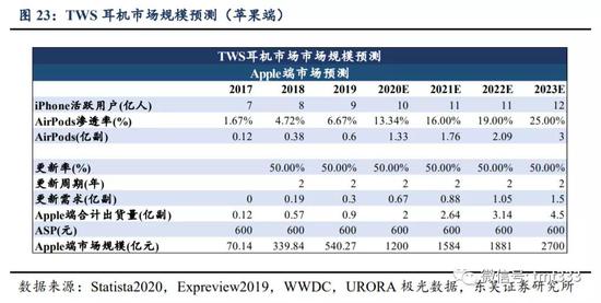 根据AirPods出货量来看,AirPods出货量增速与体量正在向iPhone看齐,目前AirPods渗透率于iPhone用户不过10%,我们认为未来还有很大提升空间。非苹果TWS耳机也在急速追赶,近来市面上非苹果TWS耳机也逐渐攻克技术难关并且攻占中低端TWS耳机市场,但目前渗透率也不及AirPods的一半。因此我们认为TWS耳机市场需求仍有较大空间并用渗透率预期进行预测,结果显示至2023年全球TWS耳机出货量将破10亿大关,整体市场将突破3500亿元。