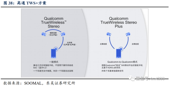 高通:推出TWS+技术,布局Qualcomm-to-Qualcomm生态。2018年2月,高通推出了TWS+技术,且TWS+技术只能在使用高通QCC5100 series/QCC30XX蓝牙芯片的TWS耳机与基于骁龙845/7XX/855/865等移动平台的手机之间实现。