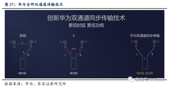 华为发布的 FreeBuds3则采用了华为自研的麒麟 A1 芯片,自研双通道同步传输技术,可以实现左右耳机从手机端分别获得左右声道的信号,实现更高效率的传输和更低的功耗。